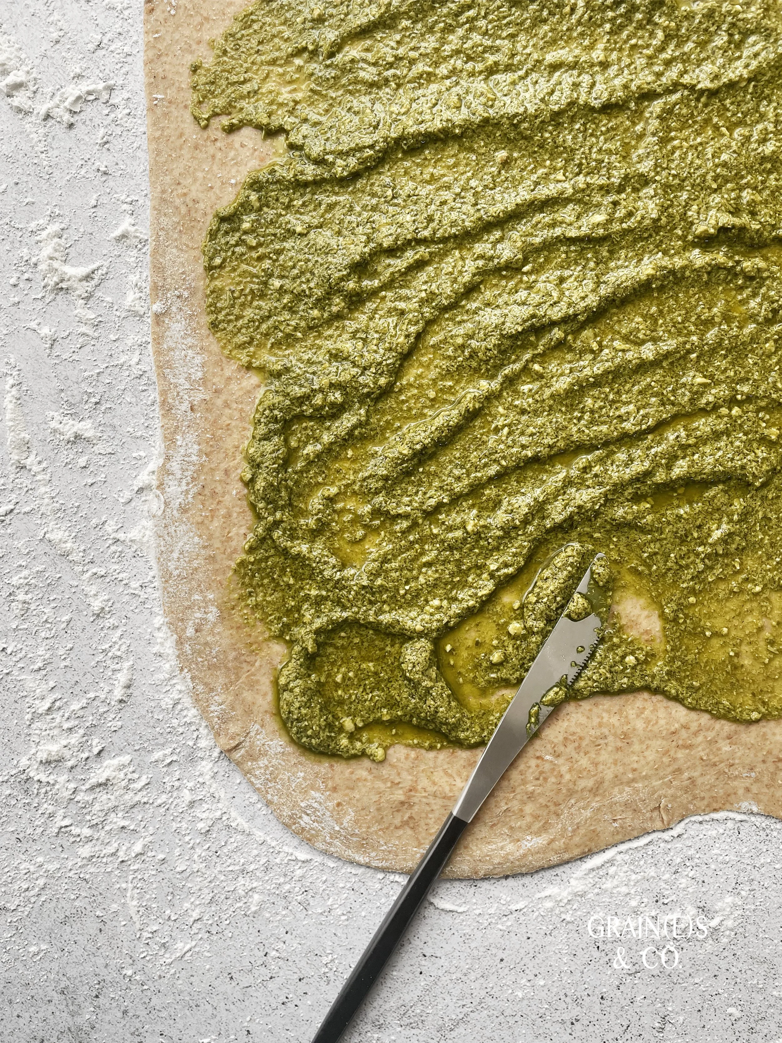 Spread the pesto onto the dough, leaving a 2-3cm border on one side.